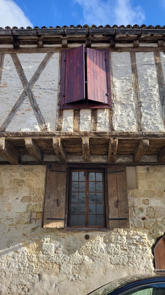 Founded in 1270, Eymet still feels wonderfully untouched by time. The heart of the village is its arcaded square, surrounded by half-timbered buildings and limestone facades that glow golden in the late afternoon light. Standing there, it is easy to notice the creaky wooden shutters, the flower-filled window boxes, and the gentle rhythm of life unfolding at a slower pace.
