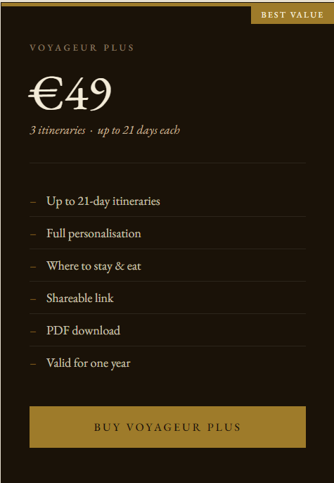 Plan up to three trips through southwest France, each up to 21 days long. Whether you are planning a longer journey, want to explore different regions on separate trips, or simply want the freedom to generate, refine, and regenerate until your itinerary feels exactly right, Voyageur Plus gives you the flexibility to do it. Full personalisation, shareable links, and PDF downloads included. Your license key will be delivered by email immediately after purchase.